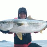 その後、下げ潮に変わって、メガネ岩に移動するも、管谷くんが15キロぐらいのカマスサワラをキャッチしたが、