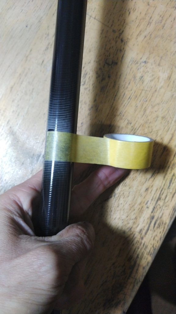 ロッドに対して直角になるように。ぐるっと1周を巻いて、巻き始めに重なれば直角だと言えるので、このマスキングテープは直角に切るガイドになります。