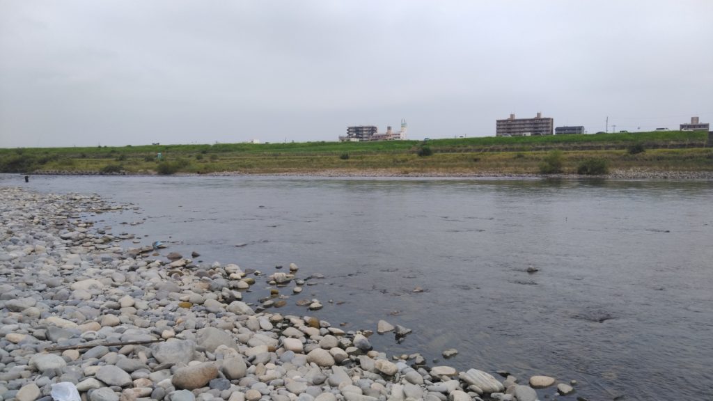 まず、長良川に沿って川を観察しつつ、車を上流に走らせながら、忠節のあたりまできたところの瀬の肩で、竿を振る人を見つけたので、お話を聞きつつ、少し離れたところに入らせてもらった。