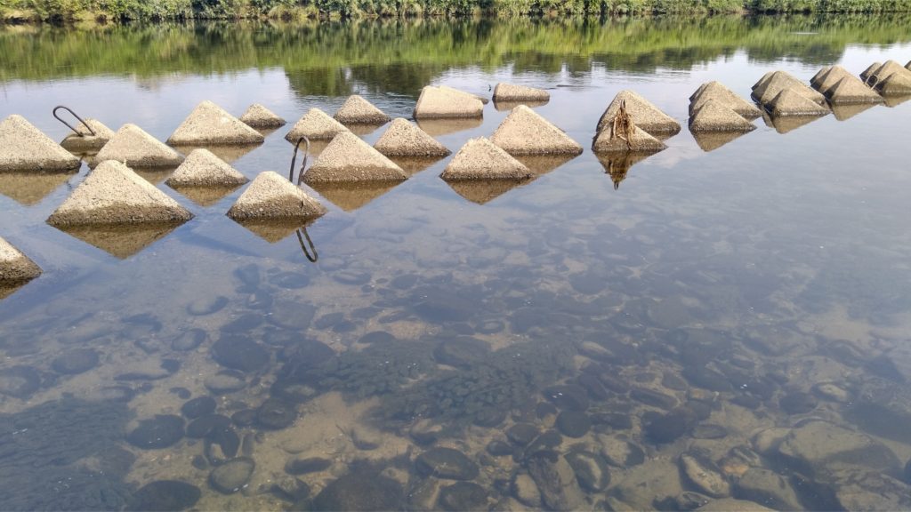 見てみると、テトラポッドの脇の流れが緩やかな所に、めちゃめちゃたくさんのアユがコケを食んでいるのが見える。